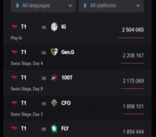 体育资讯10月24日称 外媒统计S15全球总决赛至今海外峰值前五的比赛均有T1,具体如下: