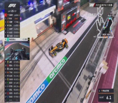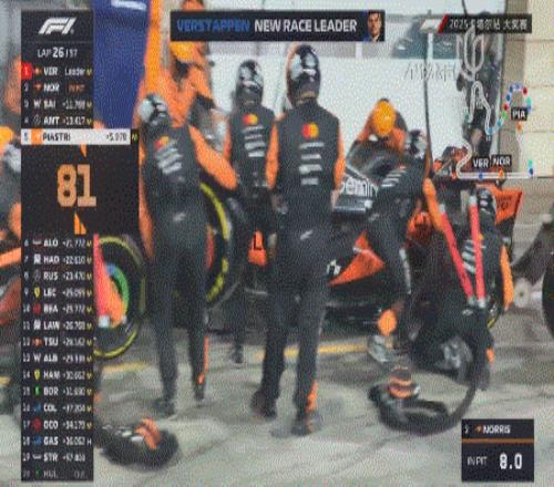 随后,除了两辆麦克拉伦之外的所有赛车都进站完成换胎!这就意味着,这些获得“免费进站”的赛车只需要再完成一停即可,而皮亚斯特里和诺里斯还需要完成两停!值得一提的是,在卡塔尔一次进站需要消耗26秒的时间!