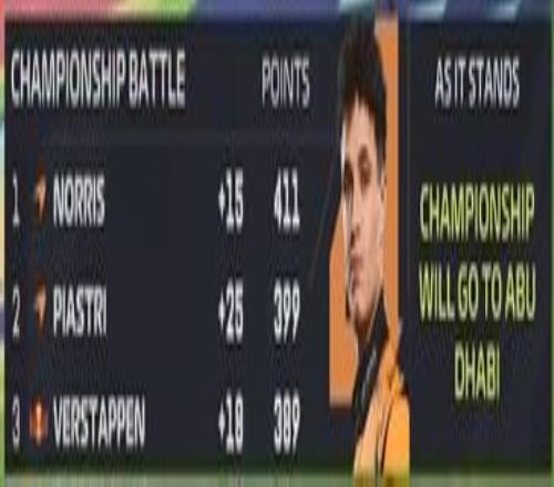 随后官方给出数据统计,如果比赛以这样的排位结束,那么皮亚斯特里将追近10个积分,维斯塔潘也将追回3分,三人将带着22分的积分差距进入阿布扎比大奖赛。