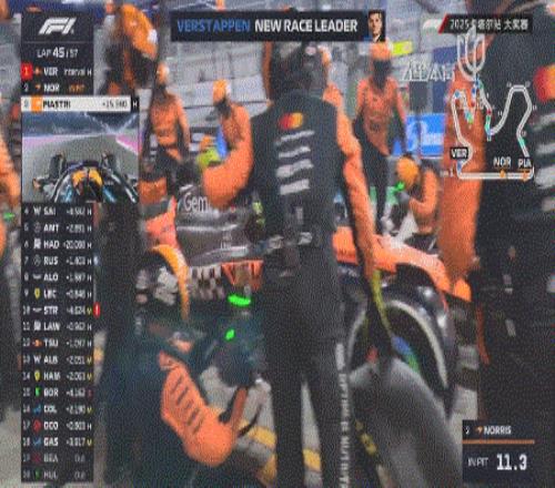 第43圈,皮亚斯特里先行进站!仅耗时1.8秒的他,出站后排在了维斯塔潘身后16秒左右的距离!而比赛还剩下14圈!