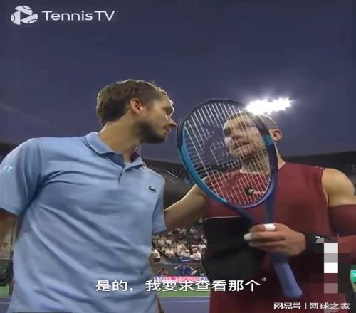 英国帅哥在发球局0-15时,俄罗斯名将回了一个贴近底线的深球,德雷珀觉得出界了便做了一个摊手的抱怨的动作。由于系统没有呼报出界,两人只能继续打,最后在七拍左右后以梅德韦杰夫回球下网而告终。