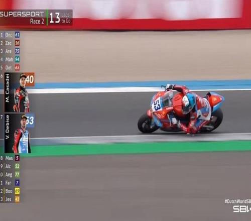 WSBK荷兰站的比赛从4月17日到19日,共举行3天。在4月17日超级杆位赛中,张雪机车的53号车手瓦伦丁·德比斯取得第二名的成绩,因此在4月18日的正赛时于前排发车。4月18日的第一回合正赛中,张雪机车53号车手因最后一圈在17号弯冲入缓冲区,超出赛道限制而被罚,最终获得第四名。